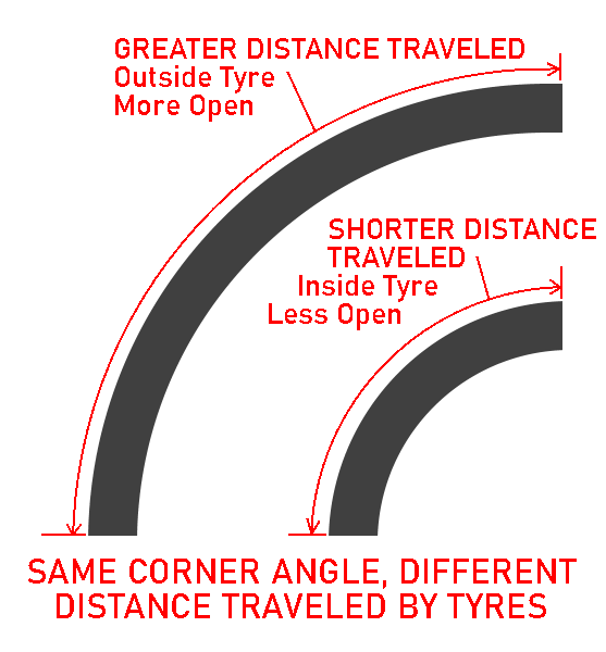 In a corner, all four of your tyres turn through circles of varying size and radii. The smaller the radius, the more severe the turn, and the less distance you need a wheel to travel the same amount of turning. With a car having an outside and inside wheel, the outside will naturally travel a further distance than the inside to turn through the same corner, because the inside tyre undergoes a much more severe turn. While this is not a problem where the wheels turn independently, a system where wheels are linked such that the inside wheel turns through the same arc as the outside, as would be required in a fixed axle system.