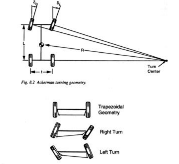 Anti-Ackerman (Reverse) – In such a setup the outside tire turns on a tighter radius than the inside. This can be seen to be used in F1 and faster race series. When a car is cornering, the outside tire is under greater load. This creates a larger slip angle on the outside wheel compared to the inside. With the Anti-Ackerman setup, the tightened radius of the outside wheel combats the greater slip angle and helps correct the path of the car, improving grip. However, this is not ideal for an FSUK car since the car is lighter and will be mostly cornering at low speed and thus won’t produce the loads necessary to justify such a setup.